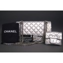 We are proud to present this timeless classic Chanel 2.55 reissue. A truly timeless purse that will last years to come and will never go out of style. This fabulous metallic leather bag features an originally designed by Coco Mademoiselle, classic silvertone chain, that can be worn as a single or double chain or tucked in to be worn as an evening clutch. The front features a silvertone twist-lock closure beautifuly engraved with the Chanel signature and a convenient patch pocket on the back of the bag. Its interior features a zip pocket on the back of the flap, an open compartment for easy access and a flap compartment with snap closure. The back of the interior flap is stitched with the Chanel CC logo. The main compartment has one open pocket and two small patch pockets. Definitely, one of the most amazing and recognizable bags today and a must for your collection.