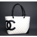 Part of the exclusive Chanel Cambon Collection is this authentic large tote bag. This beauty is crafted of sumptuous calfskin quilted white leather with an attractive iconic black Chanel entwined CC logo beautifully displayed on the front. Its exterior features knotted handles, a convenient open pocket on the back and five protective silver feet. Its interior, lined in a fluorescent pink signature fabric, offers two zipper pockets, a leather key strap, a cellphone holder and two pen holders. A very chic and stylish Chanel bag perfect for holding all your girly essentials.