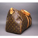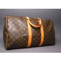 This guaranteed authentic Louis Vuitton Keepall 45 cm bag is ideal for any any short travel. It is made out of the classical monogram canvas and vachetta leather on the rolled handles and trim. Its features a large interior lined in brown canvas. Don't miss your chance to make this stylish and practical Louis Vuitton Keepall your own.