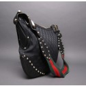 This is an authentic like new Gucci Studded Pelham Shoulder Bag. It is made out of black monogram Gg canvas, smooth black leather on the trim and corner panels and golden tone hardware. Its exterior is embellished with detail studs on the strap and bottom corners and Gucci horsebit decor on each sides of the strap. It also features a long shoulder strap with the distinctive Gucci green and red canvas stripes. It securely closes with a top zipper. Its interior lined in black cotton textile features a practical zip pocket. This functional and stylish Gucci Hobo Bag will surely bring on compliments.