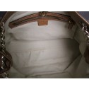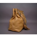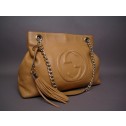 This is a Medium Gucci Soho Shoulder Bag made out of ultra soft calfskin pebbled tan leather. It is adorned with an attractive GG embossed on the front and a detachable hanging tassel detail. It also feature a double chain strap with comfortable leather pads on the top. It closes with an interior clasp. Its interior lined in natural canvas features a convenient zip pocket and two patch pockets. A glamorous and practical Gucci shoulder bag to hold all your daily essentials in style.
