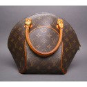 This Louis Vuitton Ellipse handbag is made in the timeless monogram canvas with natural cowhide trim, handles, and golden hardware. It features a double zip closure with polished golden metal Louis Vuitton signature zipper pulls and lock. It has a flat base and dual rolled handles for comfortably carrying it. Its interior is lined in matching brown canvas with an interior patch pocket. Perfect if you're looking for something feminine and classy.