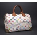 This is a very gently used Louis Vuitton multicolore LV monogram canvas Speedy 30 handbag. It is made out of vibrant multicolor LV against white background canvas, vachetta leather trim and habdles, key clochette and attractive golden tone hardware. Hardware includes studded corners, a front signature S-lock, zipper and side S-lock. Its interior is lined in red alcantra and features a roomy interior and a convenient open pocket. A truly eye-catching bag that will surely bring on compliments. Don’t miss out.