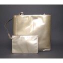 Simple and stylish is this authentic Prada greenish vernis leather tote. Its exterior features two protective brown rubber corners and two comfortable soft straps. Interior of handbag is lined in a matching metallic Prada signature fabric and has two main compartments, two zipped pockets, an open pocket and a detachable small pocket that hangs from a strap. What a great opportunity to own this beauty at much less than retail.